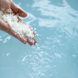 取50g的沐浴鹽( 約1/4 瓶蓋量) 倒入水中( 約200L),均勻混和後入浴。